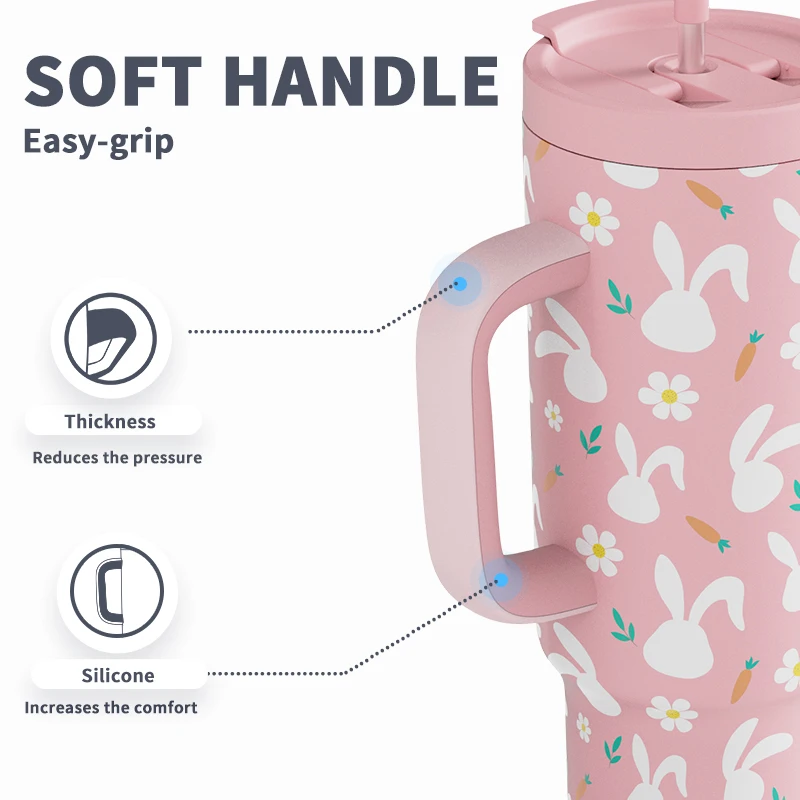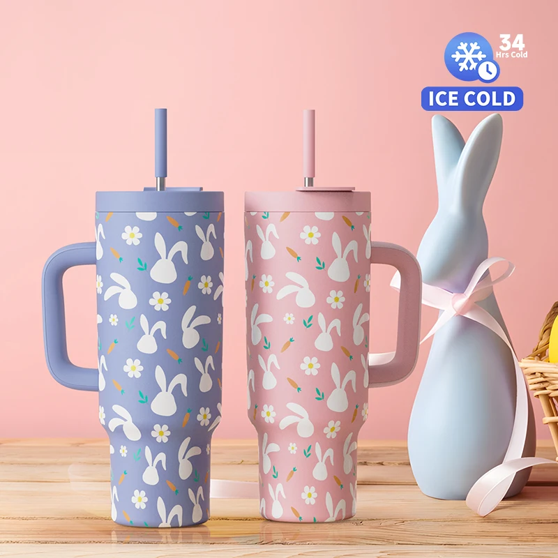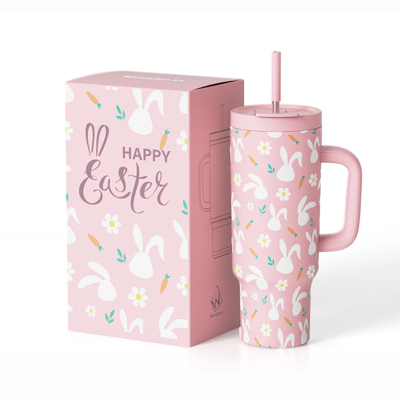 Stap in 2025 met deze pastelkleurige 40 oz Easter tumbler: roestvrij staal, geschikt voor auto-cups, vacuümgeïsoleerd om cacao warm of ijskoffie koud te houden. In een cadeauverpakking met konijnencharm – perfecte Paschacadeau voor elke koffieliefhebber!